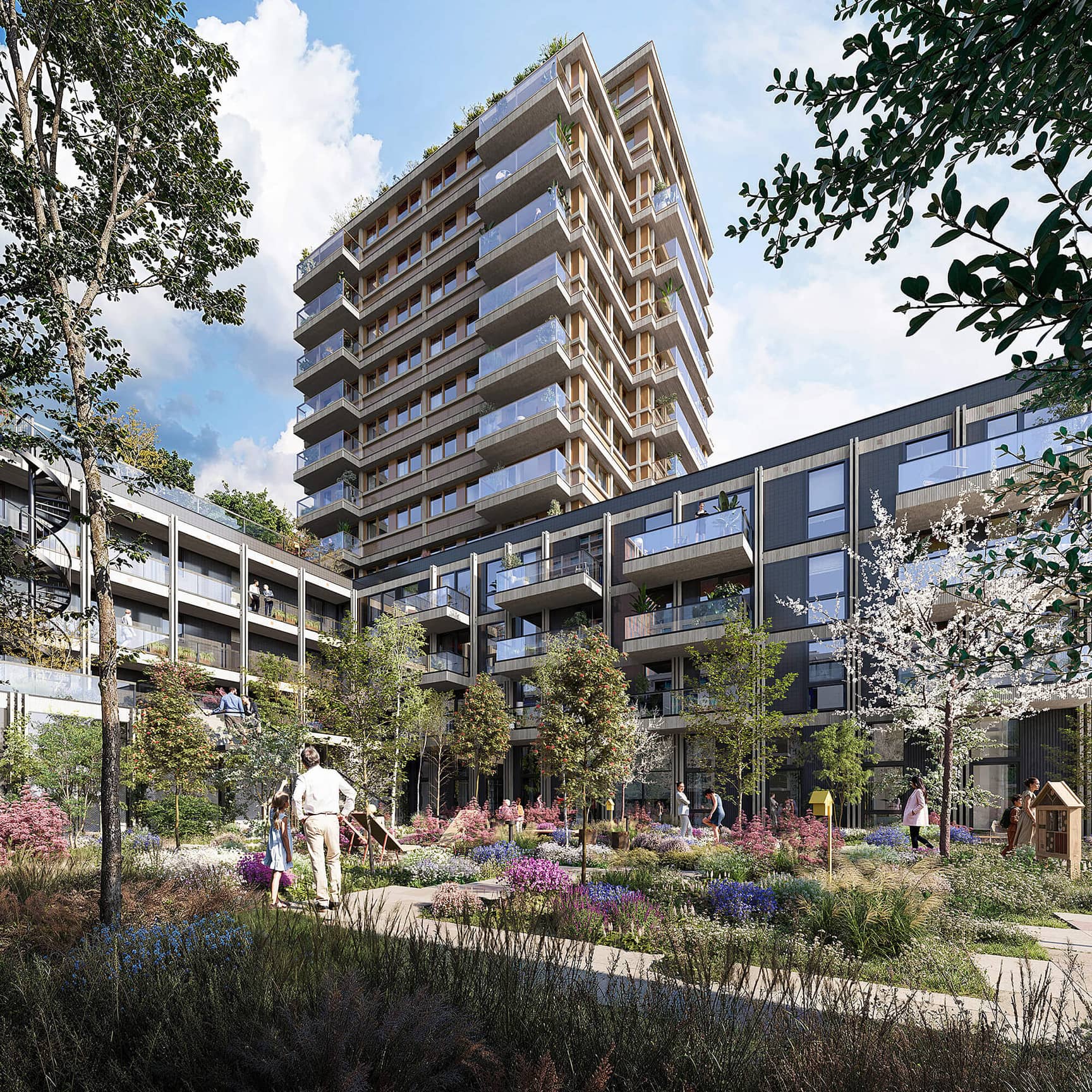 In de plint is plek voor bedrijvigheid, en bewoners delen hier een gemeenschappelijke woonkamer – een plek om elkaar te ontmoeten. Een praatje met je buren doe in de gezamenlijke ‘huiskamer’ op het dakterras of op een bankje in de groene binnentuin. ’s Zomers is dit de perfecte plek voor een moment van rust, omgeven door bruisende stadsnatuur.
